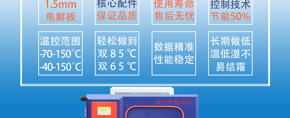 产品型号:JQTH-225L 品牌:剑 乔 用途:新款恒温恒湿试验箱(JQTH-225L),主要用来测试各种材料耐热、耐寒、耐干、耐湿的性能。本机采用中英俄文显示彩色触控式屏幕画面,操作简单,程序编辑容易可显示完整的系统操作状况咨询热线:13829135130