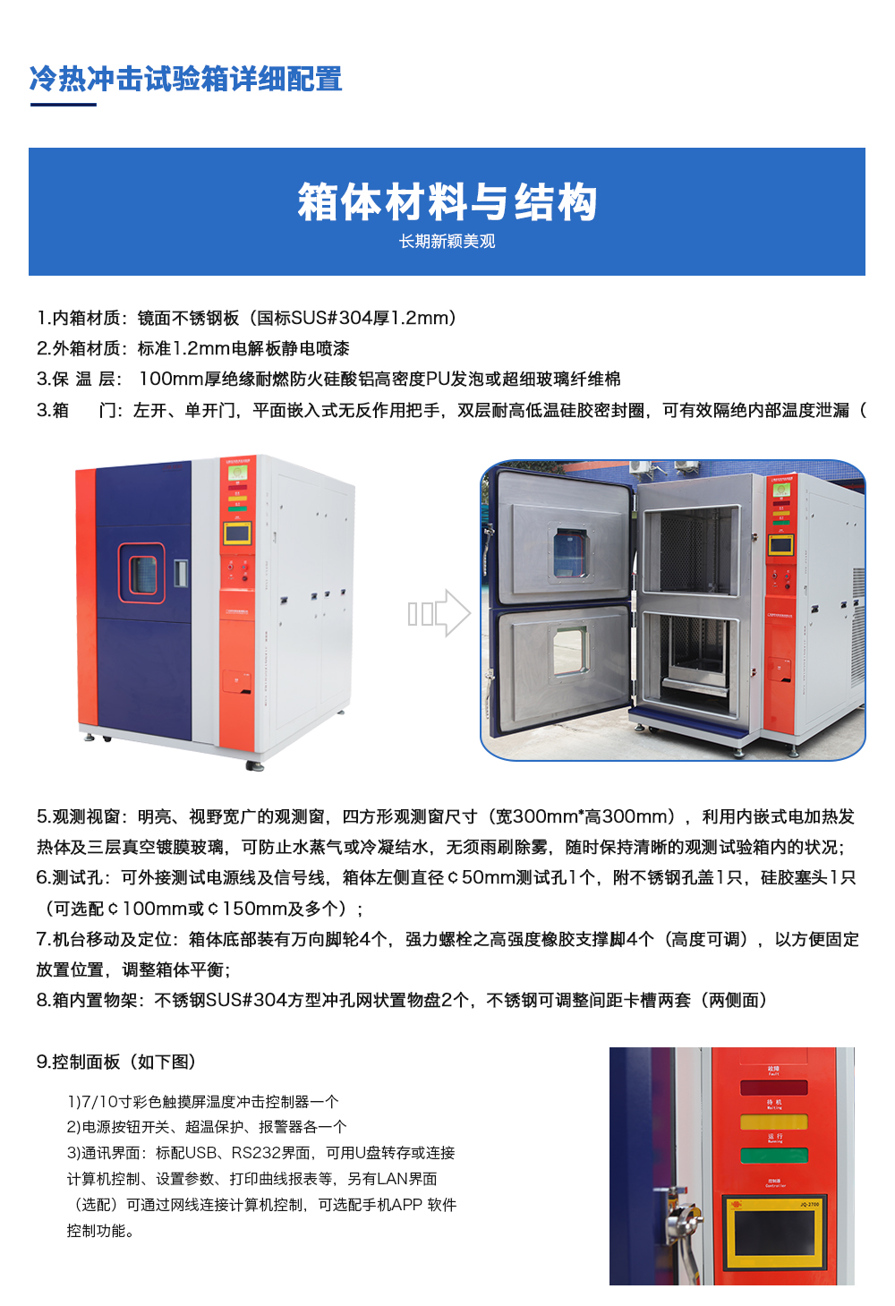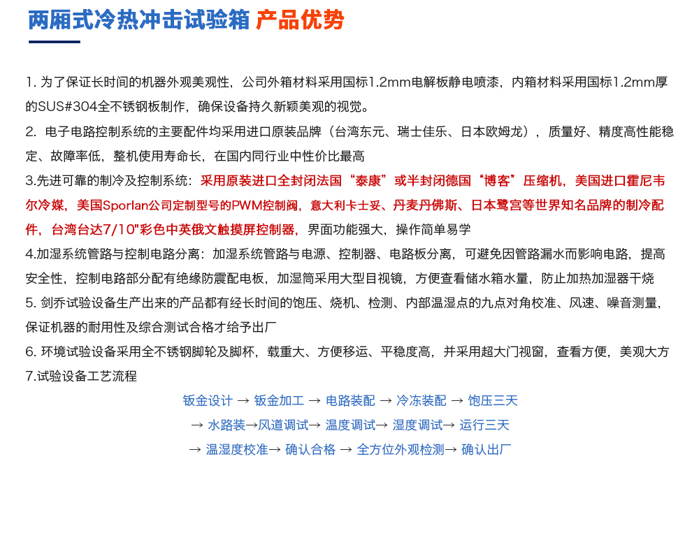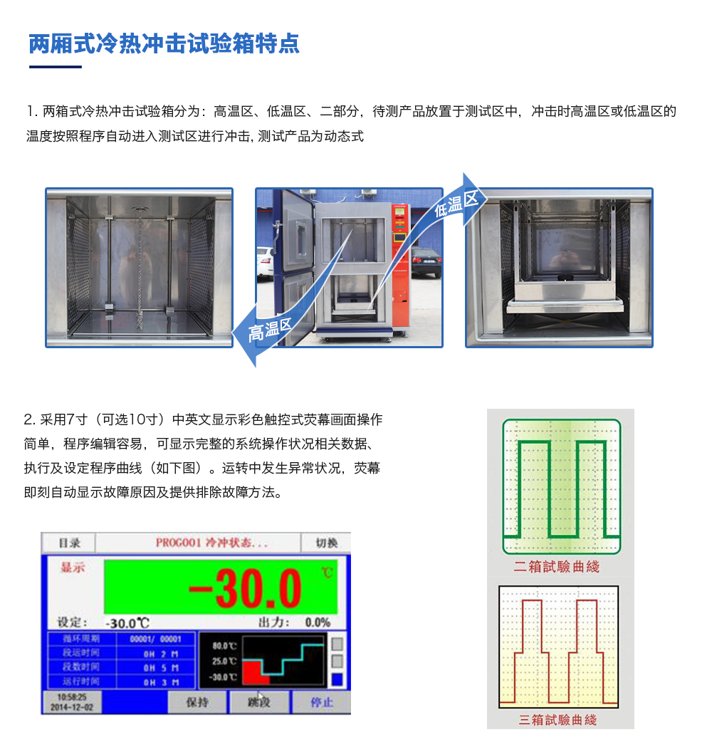 产品型号:JQTS2-408 品牌:剑 乔 用途:两厢式冷热冲击试验箱又名温度冲击试验箱或高低温冲击试验箱是用于考核产品对周围环境温度急剧变化的适应性,装备设计定型的鉴定试验和批产阶段的例行试验中不可缺少的试验咨询热线:13829135130