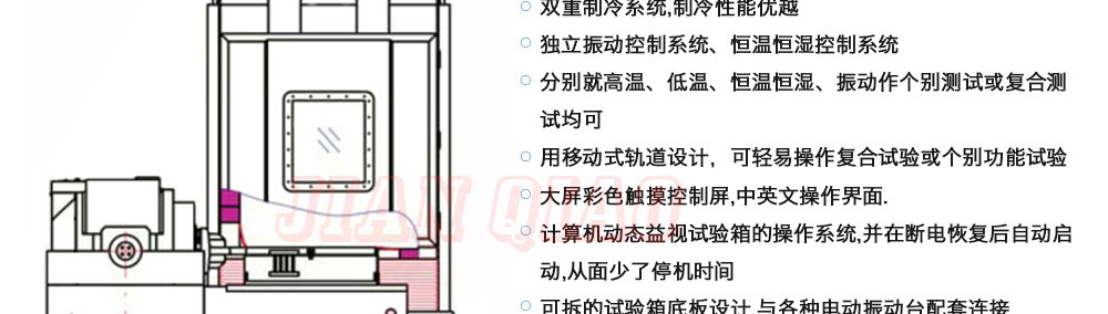 产品型号:JQTHV-1000 品牌:剑 乔 用途:三综合试验箱:主要是试验箱和振动试验系统的综合,试验时将温度、湿度、振动(高温或低温),(正弦振动或随机振动)以及电应力按规定的周期综合在同一气候试验箱中施加到咨询热线:13829135130