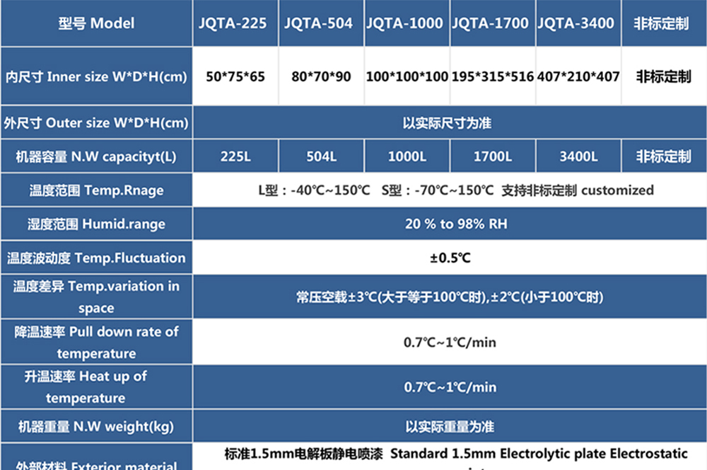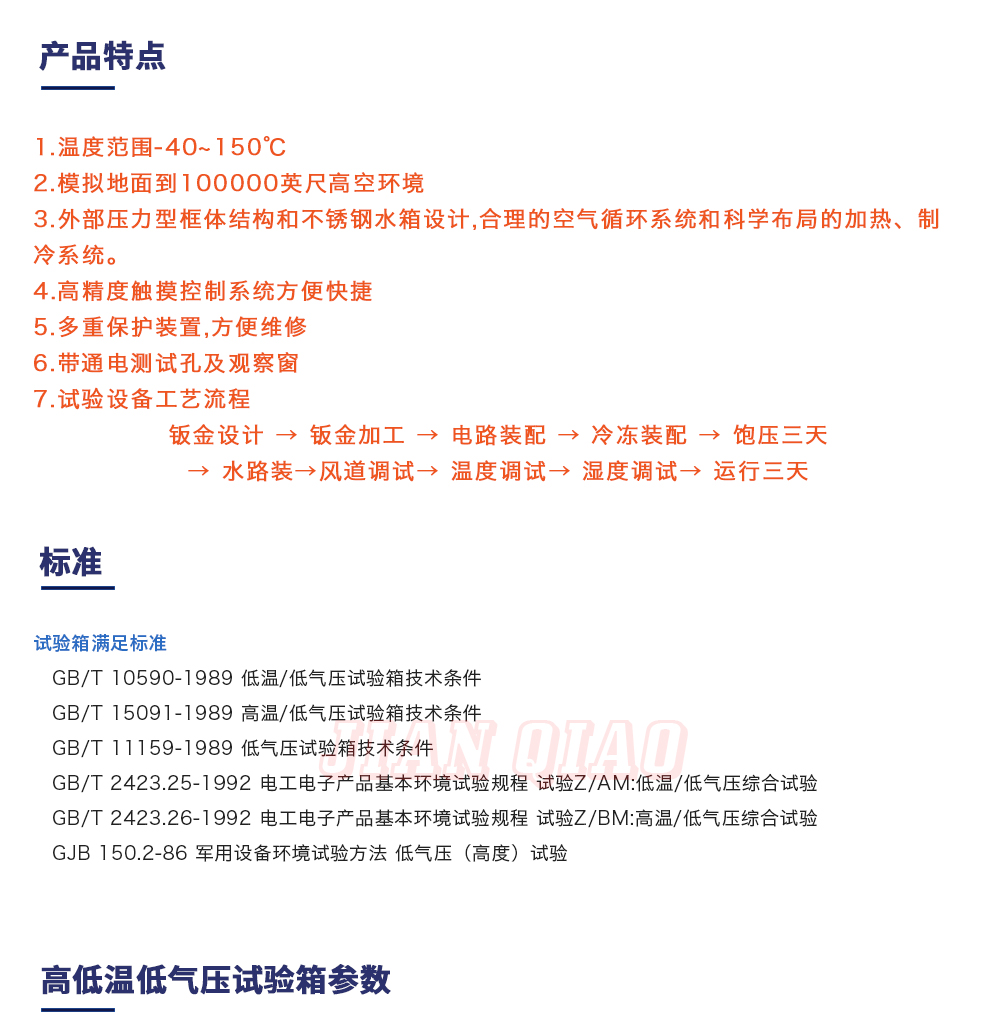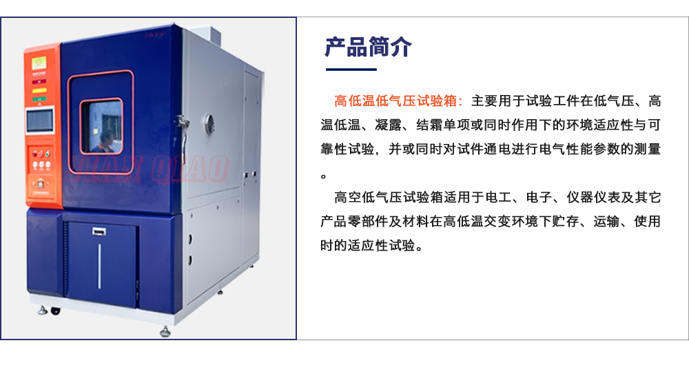 产品型号:JQTA-225 品牌:剑 乔 用途:高低温低气压试验箱:主要用于试验工件在低气压、高温低温、凝露、结霜单项或同时作用下的环境适应性与可靠性试验,并或同时对试件通电进行电气性能参数的测量。咨询热线:13829135130