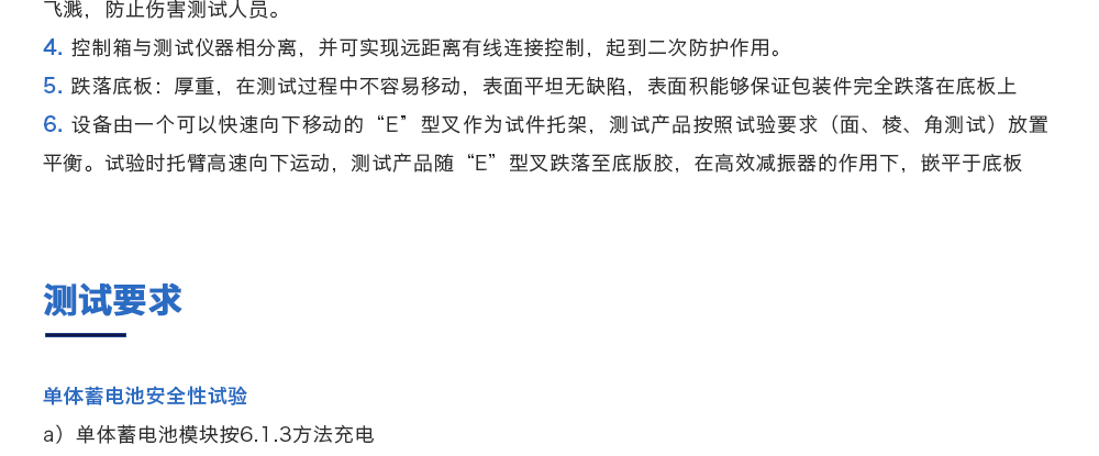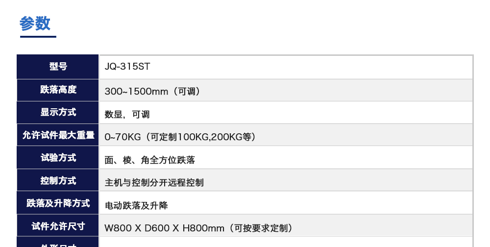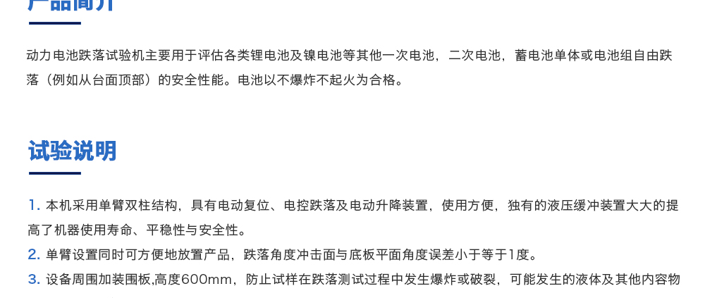 产品型号:JQ-315ST 品牌:剑 乔 用途:动力电池跌落试验机主要用于评估各类锂电池及镍电池等其他一次电池,二次电池,蓄电池单体或电池组自由跌落(例如从台面顶部)的安全性能。电池以不爆炸不起火为合格。咨询热线:13829135130