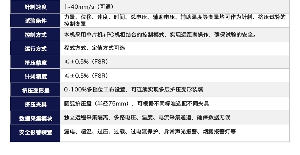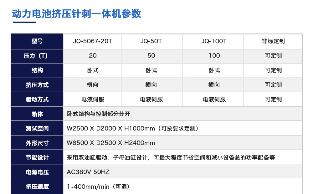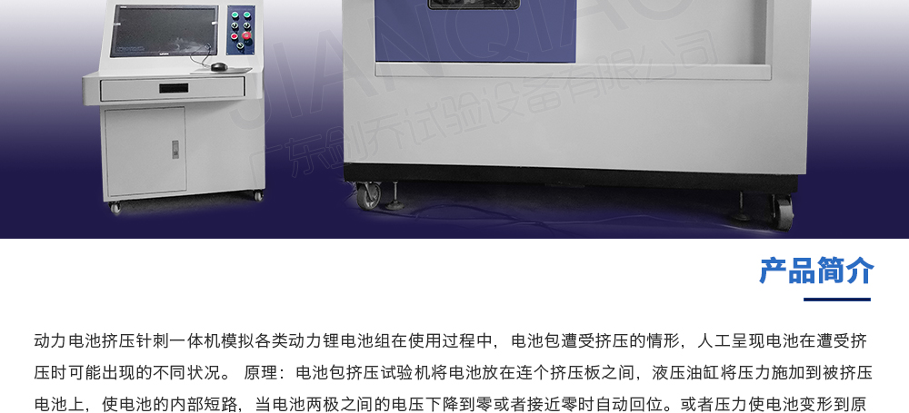 产品型号:JQ-5067-20T(可定制) 品牌:剑 乔 用途:动力电池挤压针刺一体机模拟各类动力锂电池组在使用过程中,电池包遭受挤压的情形,人工呈现电池在遭受挤压时可能出现的不同状况。 原理:电池包挤压试验机将电池放在连个挤压咨询热线:13829135130