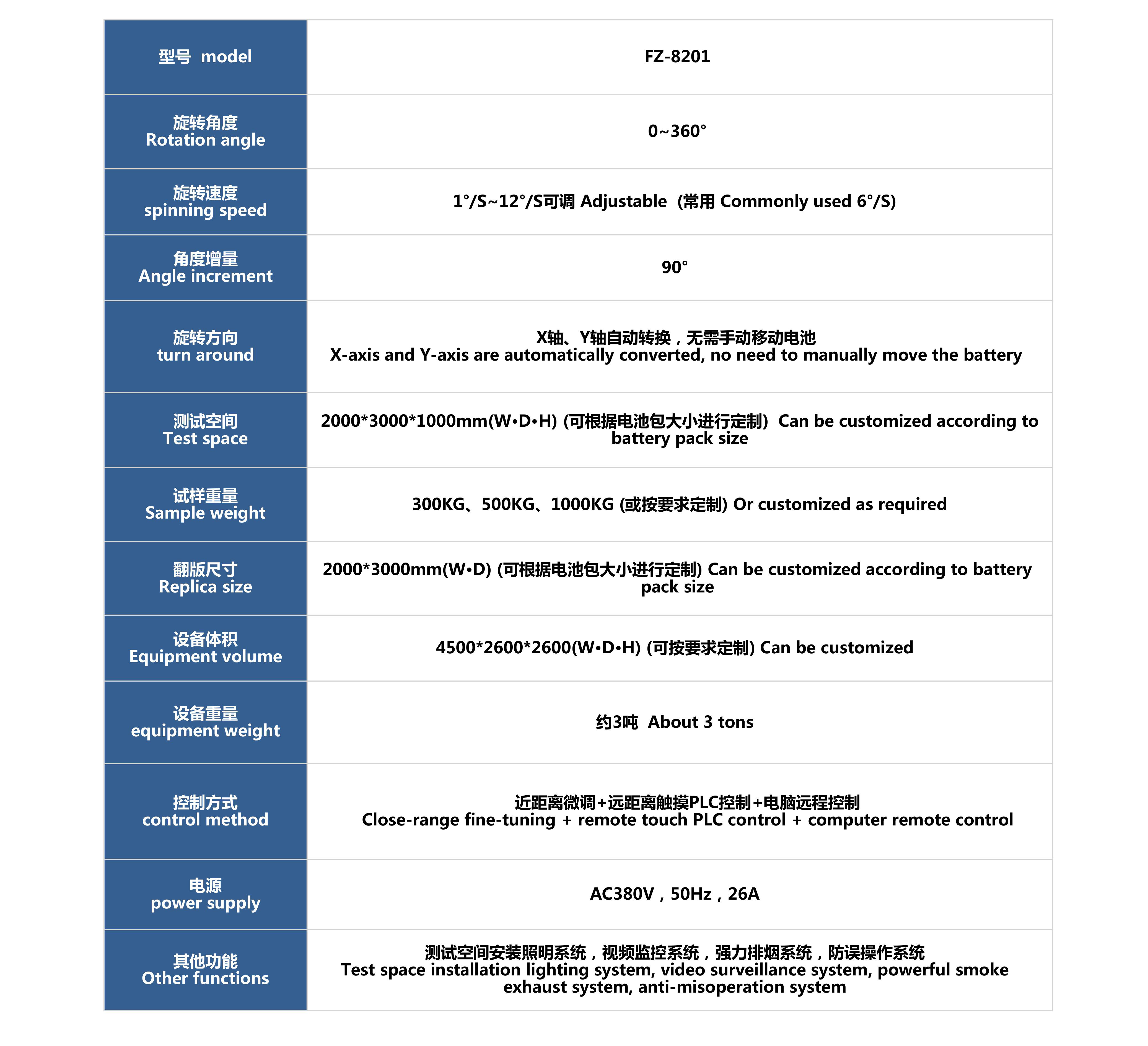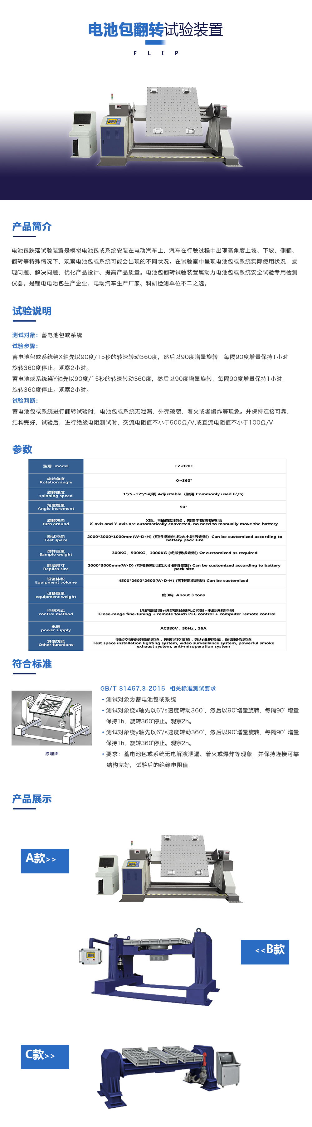 产品型号:JQ-8201 品牌:剑 乔 用途:电池包翻转试验台是模拟电池包或系统安装在电动汽车上,汽车在行驶过程中出现高角度上坡、下坡、侧翻、翻转等特殊情况下,观察电池包或系统可能会出现的不同状况。在试验室中咨询热线:13829135130