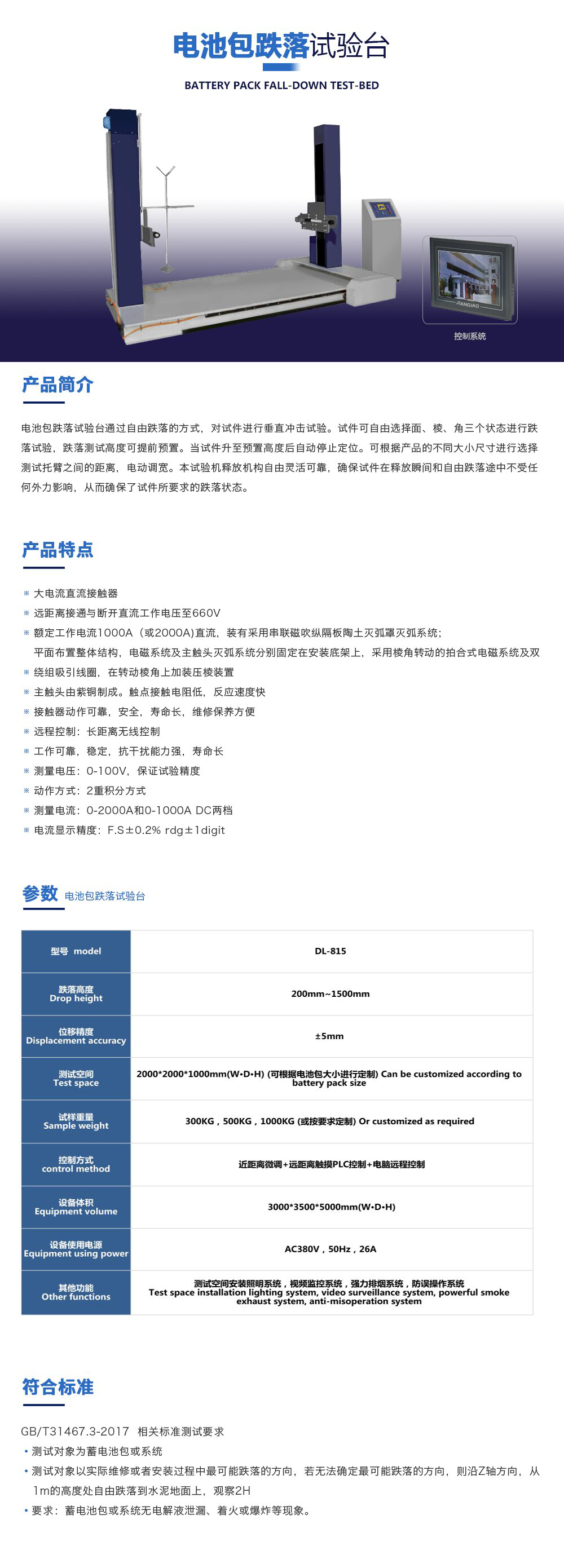 产品型号:JQ-F-815 品牌:剑 乔 用途:电池包跌落试验台通过自由跌落的方式,对试件进行垂直冲击试验。试件可自由选择面、棱、角三个状态进行跌落试验,跌落测试高度可提前预置。当试件升至预置高度后自动停止定位咨询热线:13829135130