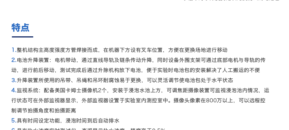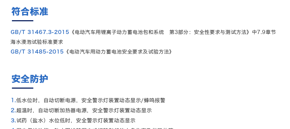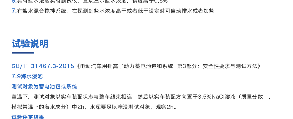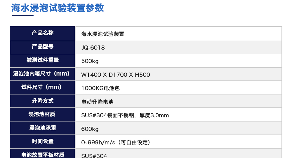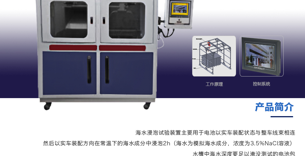 产品型号:JQ-6018 品牌:剑 乔 用途:海水浸泡试验装置主要用于电池以实车装配状态与整车线束相连然后以实车装配方向在常温下的海水成分中浸泡2h(海水为模拟海水成分,浓度为3.5%NaCl溶液)水槽中海水深度要足以淹咨询热线:13829135130