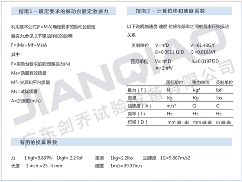 振动试验作为航空、航天、国防、汽车、电子等行业进行产品结构的耐振性、可靠性和完好性测试的重要工具,大多数企业在选择振动试验台时,搞不明白推力、加速度与试验品重量之间的关系,这也导致选型困难,买错设备的情况发生,下面由广东剑乔小编给大家普及一下: