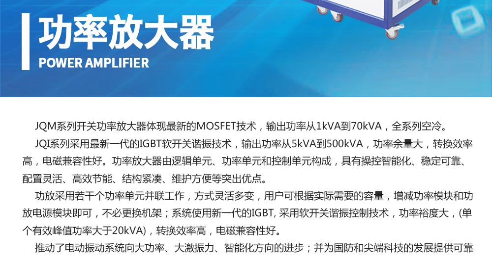 用途:功率放大器由逻辑单元、功率单元和控制单元构成,具有操控智能化、稳定可靠、配置灵活、高效节能、结构紧凑、维护方便等突出优点。