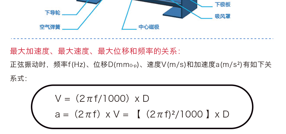 用途:正弦振动时,频率f(Hz)、位移D(mm0-p)、速度V(m/s)和加速度a(m/s²)有如下关系式: