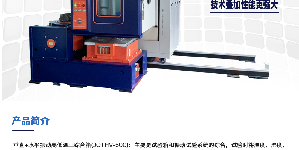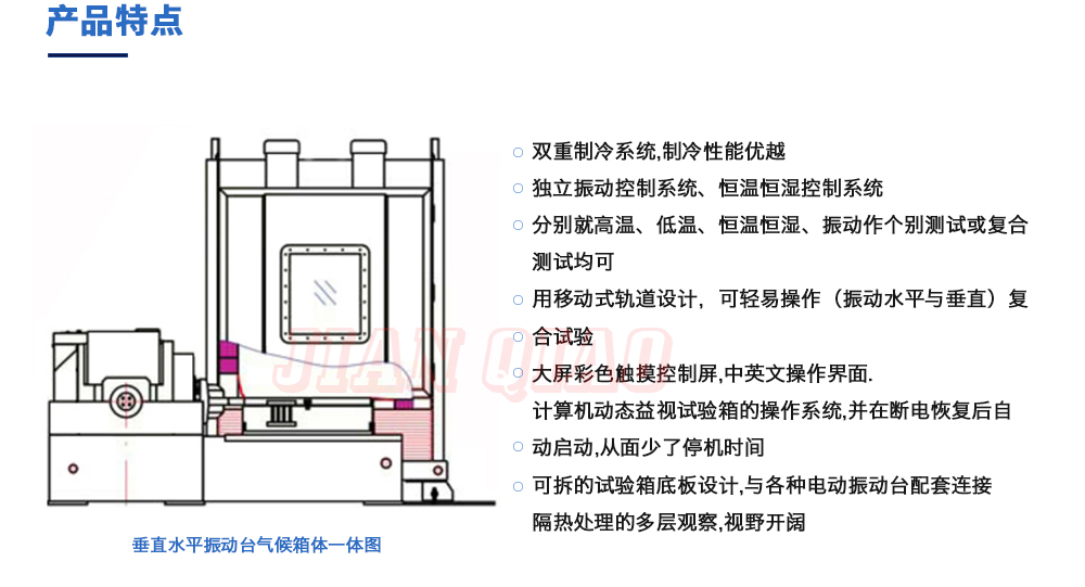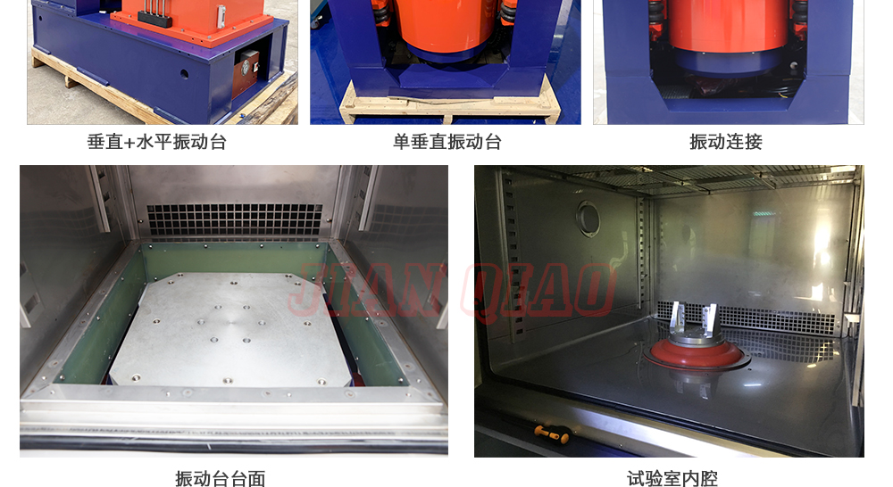 产品型号:JQTHV-500 品牌:剑 乔 用途:垂直+水平振动高低温三综合箱(JQTHV-500):主要是试验箱和振动试验系统的综合,试验时将温度、湿度、振动(高温或低温),(正弦振动或随机振动)以及电应力按规定的周期综合在同一气候试验箱中施加到样品上进行温度、湿度、振动的“环境仿真”试验。咨询热线:13829135130