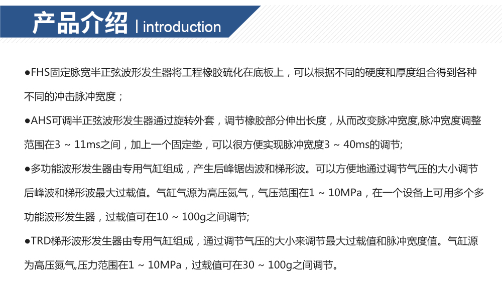 用途:FHS固定脉宽半正弦波形发生器将工程橡胶硫化在底板上,可以根据不同的硬度和厚度组合得到各种不同的冲击脉冲宽度。